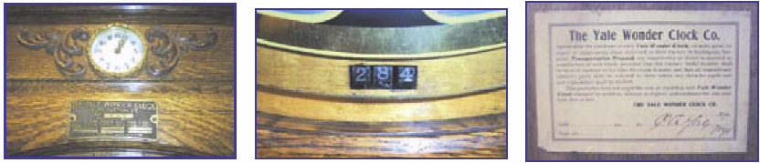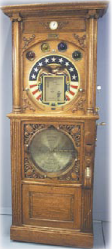 These are amazing machines for when you put your nickel in and pull the handle you will get a token back in trade,the advertising cards slide across in the window,the music with twelve bells plays music, one of the four lights will light up to indicate the payoff, and it even has three reels with numbers under the glass wich spin in order to bet on. I t is intresting how this huge machine gets its name the Yale Wonder Clock from a little 3" clock on the front of the machine. I am currently researching and working on an article on the Yale Wonder Clock for a future article in the C.O.C.A. TIMES so if you have any information on this machine you would like to share, let me know at jtduck@msn.com or 816-835-3316.